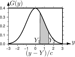 図2.3の影つきの部分の面積 \(\displaystyle\int_{Y_1}^{Y_2}G(y)dy\) は、測定値 \({y}\) が \({Y}_1\) と \({Y}_2\) の間にある確率を表わす。